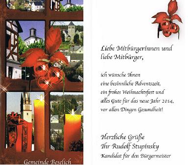 Bürgermeisterkandidat Rudolf Stupinsky übermittelt allen Beselichern seine Weihnachtswünsche per Postkarte.