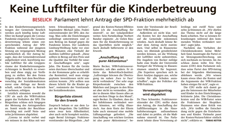 Die SPD Fraktion hatte zur letzten Sitzung der Gemeindevertretung beantragt, für alle Beselicher Kitas mobile Hepa Luftfilter anzuschaffen. Eine Investition von max. 1000 € pro Gruppenraum sollte zum Herbst erfolgen. "Wir wollten damit einen Beitrag zum Schutz von Kindern und ErzieherInnen leisten" so der SPD Fraktionsvorsitzende Michael Jahn. In der Sitzung der Gemeindevertretung zweifelten "WIR" die Sinnhaftigkeit an und die CDU wollte den Antrag in die Haushaltsberatungen in den Dezember verweisen - wohlwissend, dass im laufenden Haushalt viele Investitionen nicht getätigt wurden und jede Menge Restmittel vorhanden gewesen wären.