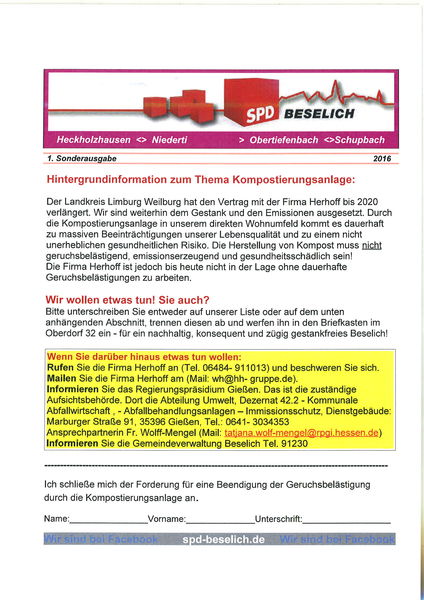Daher unser Aufruf an Sie, bitten schließen Sie sich unserer Forderung für eine Beendigung des Gestankes durch die Kompostierungsanlage mit Ihrer Unterschrift an! Unsere Fraktion hat hierzu eine Protestaktion gestartet und möchte Unterschriften für unseren Protestbrief sammeln.